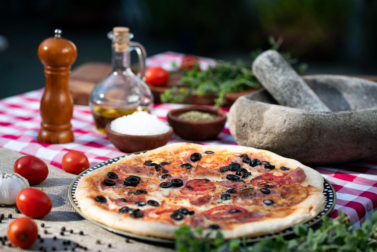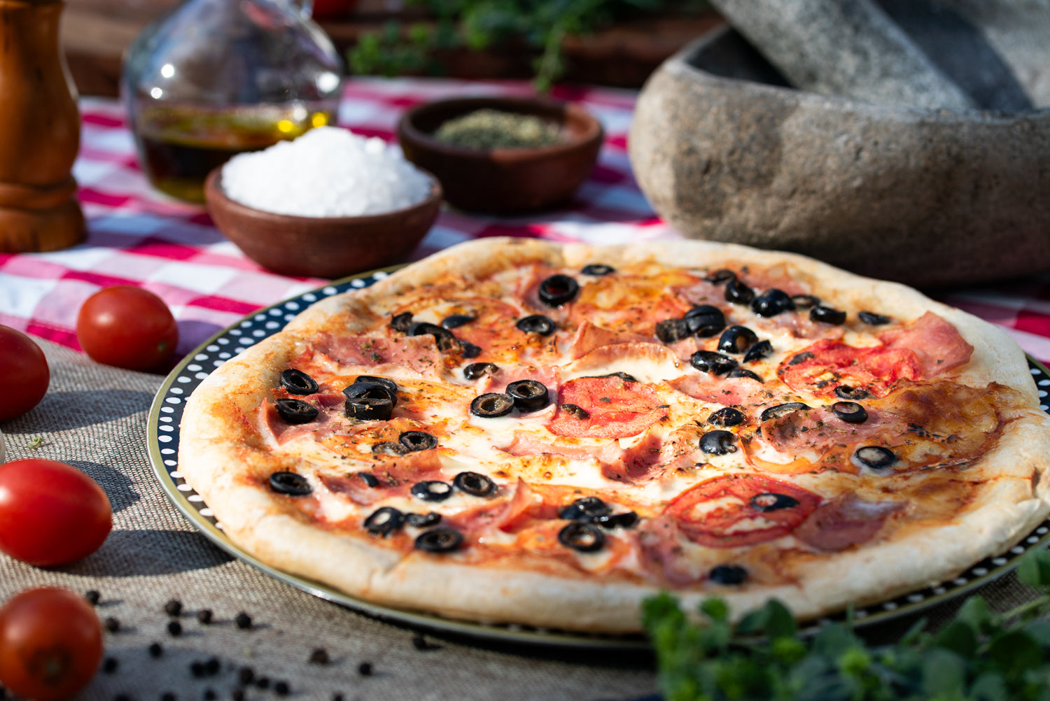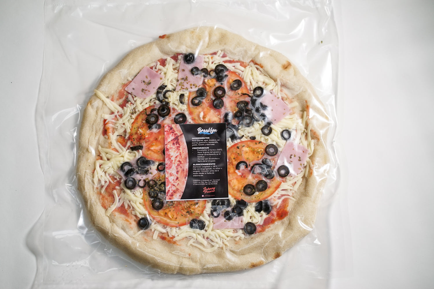 Combinación de pomodoro, mozzarella, jamón pierna, tomate y aceitunas negras que le dan un toque único.