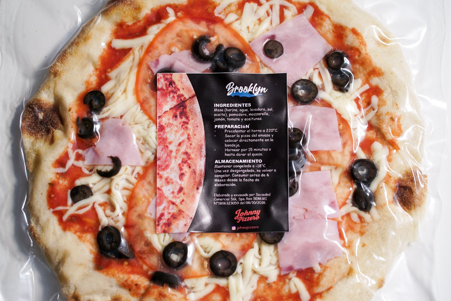 Combinación de pomodoro, mozzarella, jamón pierna, tomate y aceitunas negras que le dan un toque único.